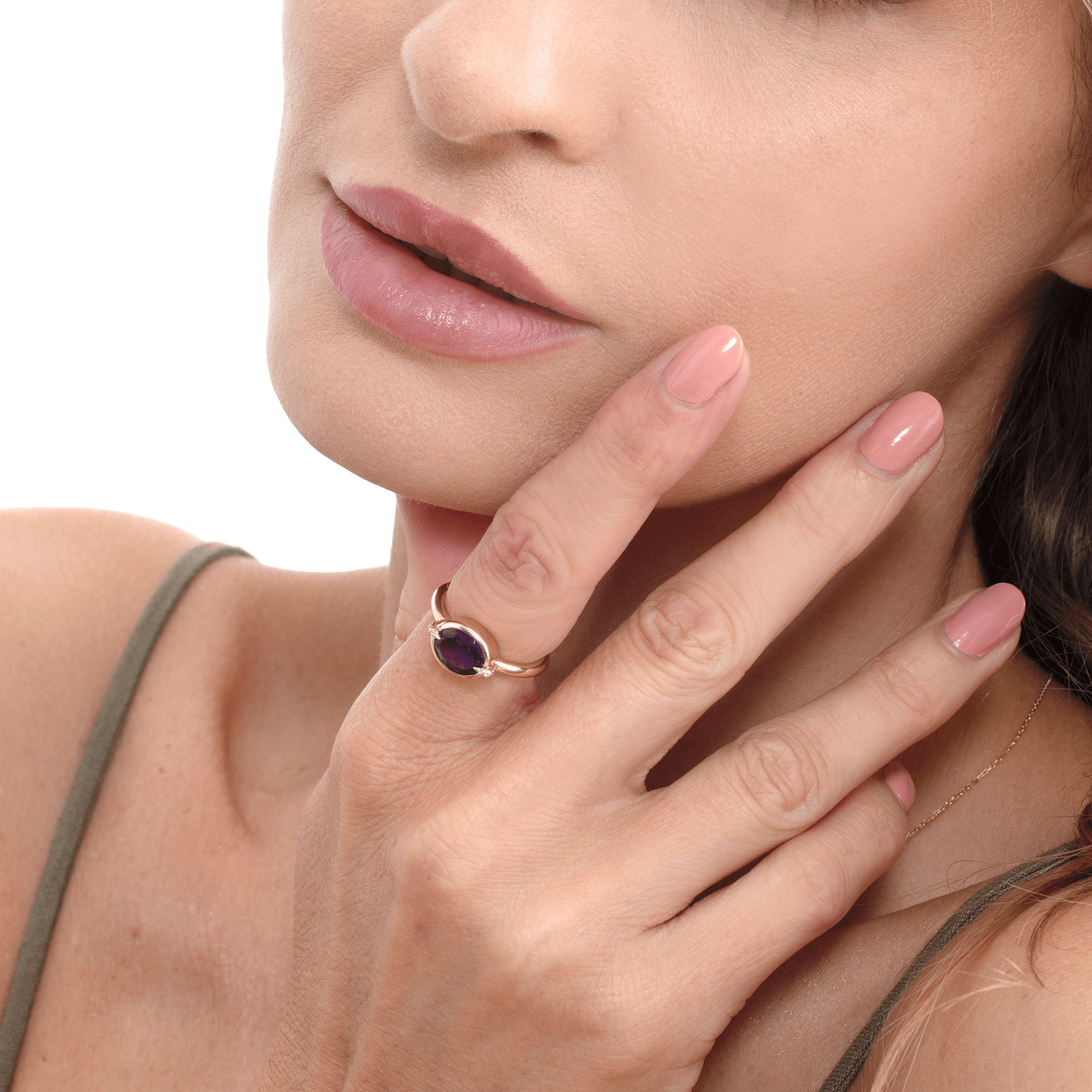 The Celestial Grip Ring is an eye-catching, regal piece that will help you unleash your inner majesty. The focal point is a captivating oval-cut natural amethyst that exudes vivid purple hues that arouse feelings of mystique and royalty. The amethyst's beauty is further enhanced by a delicate moissanite claw accent, which adds a touch of sparkle and sophistication to the elegant bezel setting, which can be made of platinum or sterling silver.