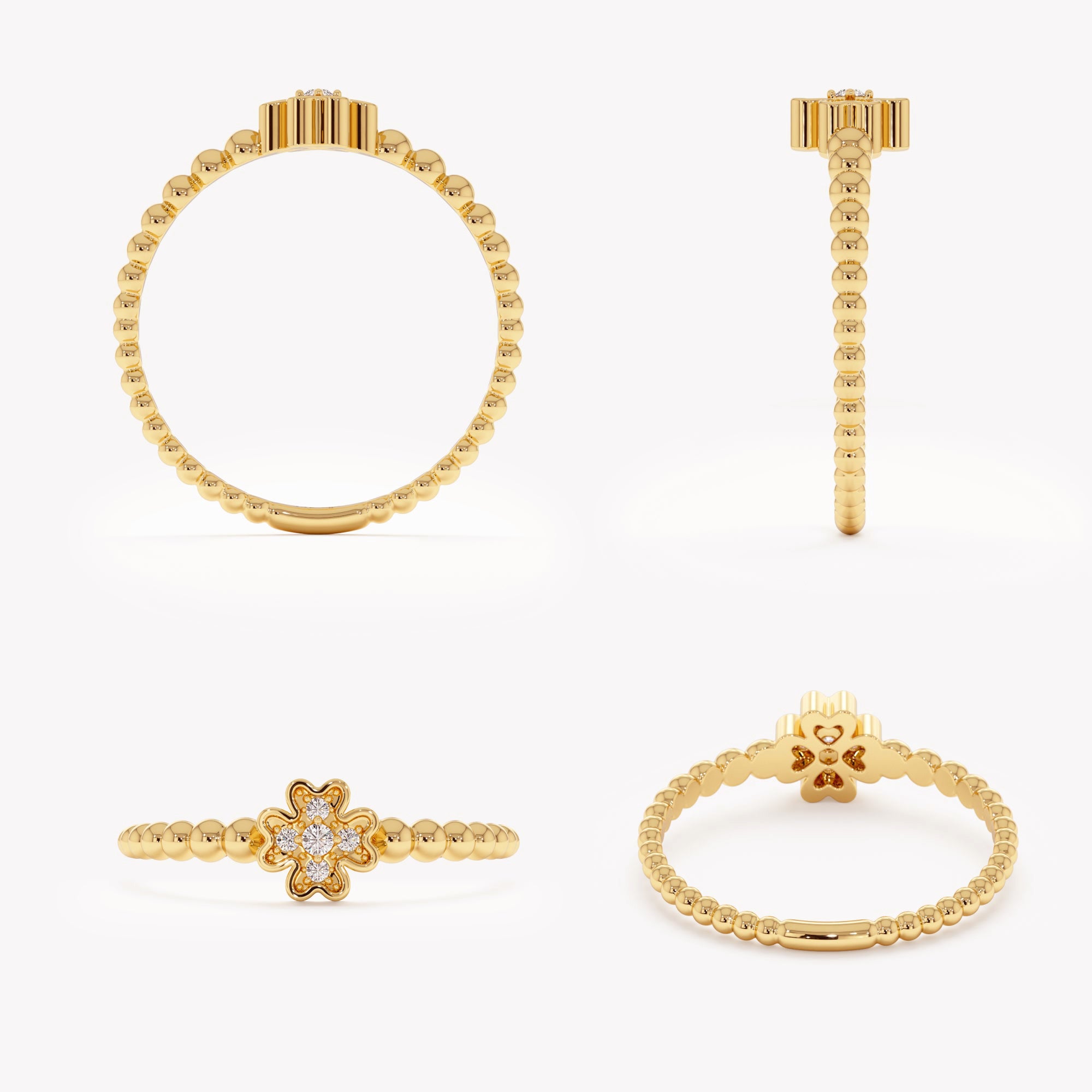 Embrace the charm of luck and elegance with our Diamond Clover Ring. This dainty stacking ring features a delicate four-leaf clover design, adorned with sparkling diamonds, set on a solid gold beaded band. A perfect blend of minimalist style and symbolic meaning, this ring is a charming addition to any jewelry collection.