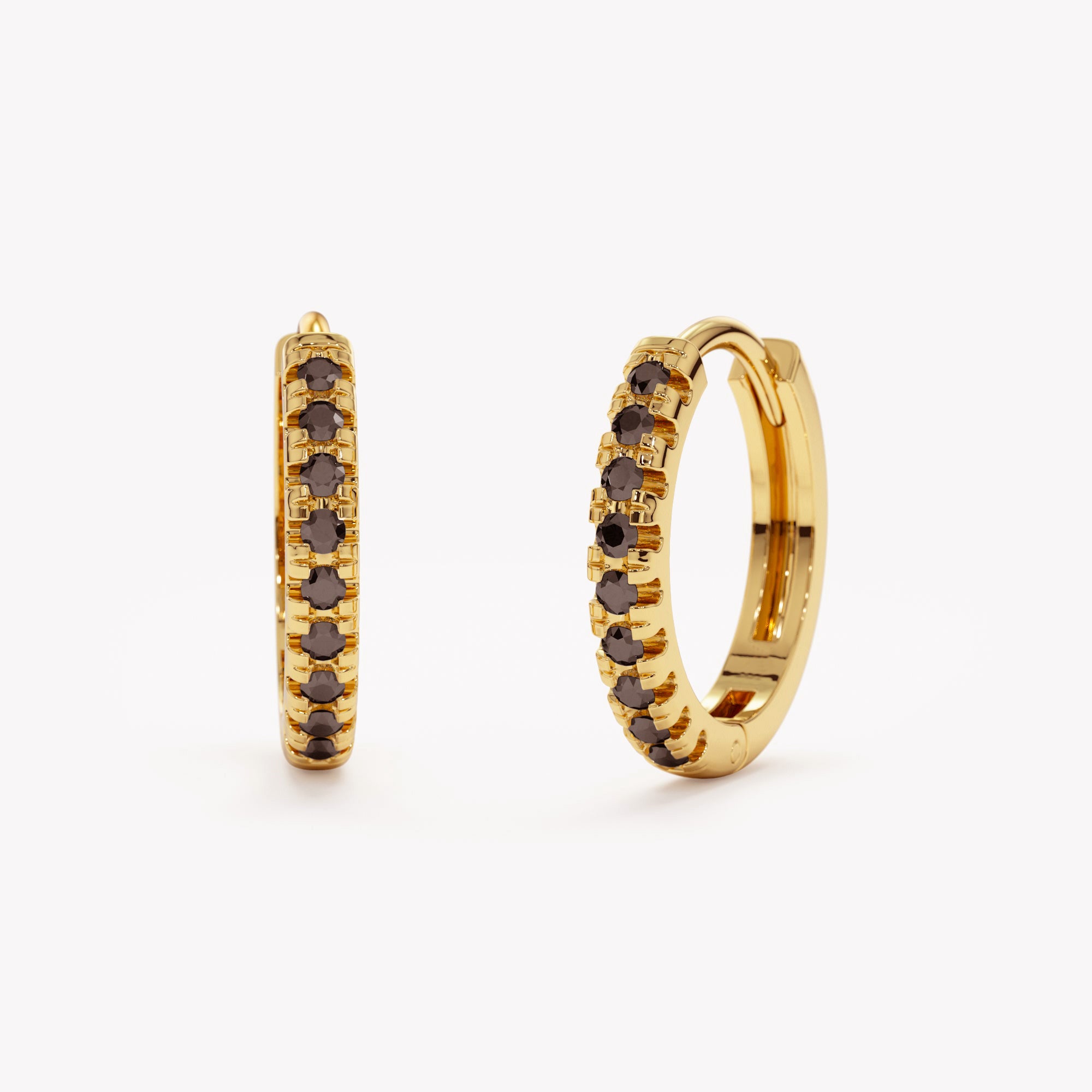 The Onyx Luxe Moissanite Hoops Earrings will add a bit of edgy elegance. These earrings, which are made of sterling silver and lined with sparkling black moissanite stones, blend contemporary design with adaptability. While the moissanite's dark sparkle adds a bold, sophisticated accent for any occasion—day or night—their snug huggie design guarantees comfort.