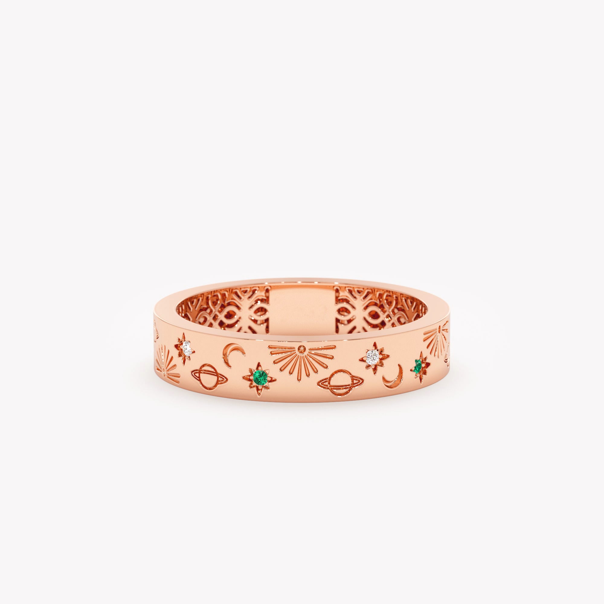 The captivating Starry Sky Emerald Diamond Ring, made of solid sterling silver, will pique your interest in the cosmos. A crescent moon, a bright star, a fiery sun, and a majestic Saturn are among the carefully engraved symbols of the universe that adorn this celestial masterpiece's flat, solid silver band. This distinctive space-inspired design is infused with a hint of celestial sparkle from emerald accents and sparkling moissanite diamonds.