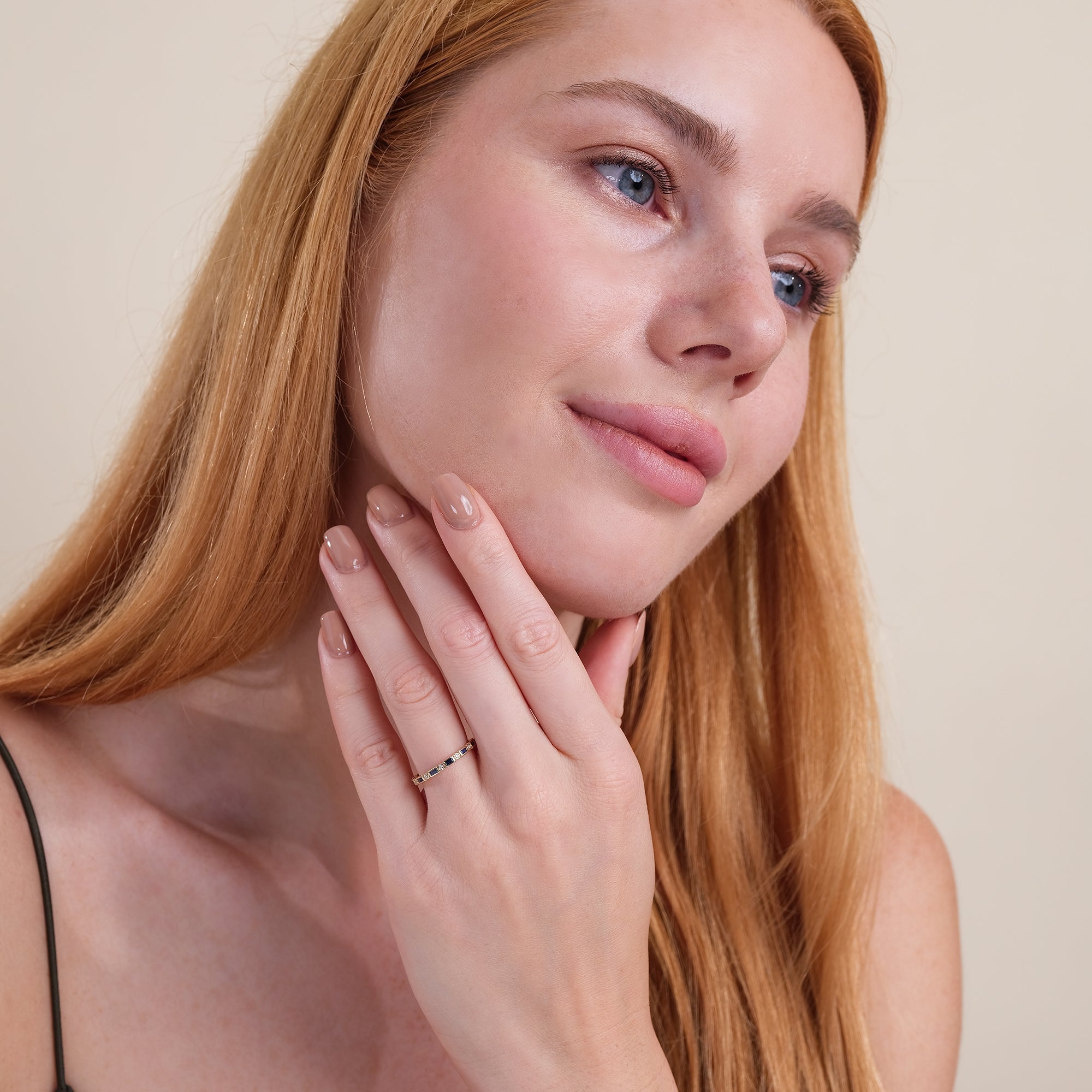 Each round moissanite stone and baguette sapphire alternate in this sterling silver eternity ring, which is painstakingly bezel-set to produce an endless circle of brilliance. The sparkling moissanite adds a touch of sophistication, while the sapphires' deep blue charm, which represents wisdom and nobility, harmonizes with it. This delicate ring is a tribute to exquisite craftsmanship and the timeless appeal of priceless gemstones, making it the ideal September birthday present.