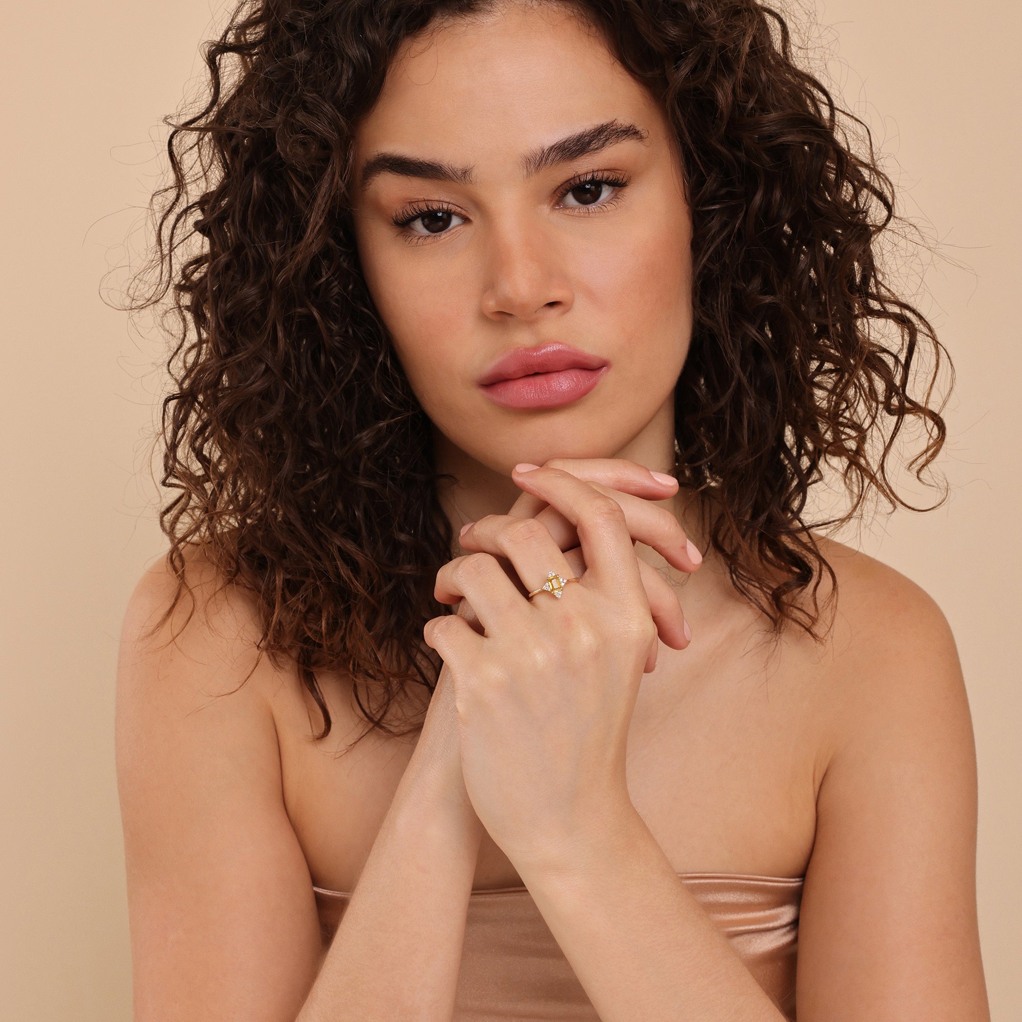 The Yellow Topaz Moissanite Statement Ring is a magnificent piece that honors the warmth and brilliance of your special occasion. Make a statement with it. Four delicate clusters of natural Moissanite diamonds encircle a vivid emerald-cut Yellow Topaz gemstone in this striking ring. This sterling silver ring is a conversation starter that goes well with any outfit.