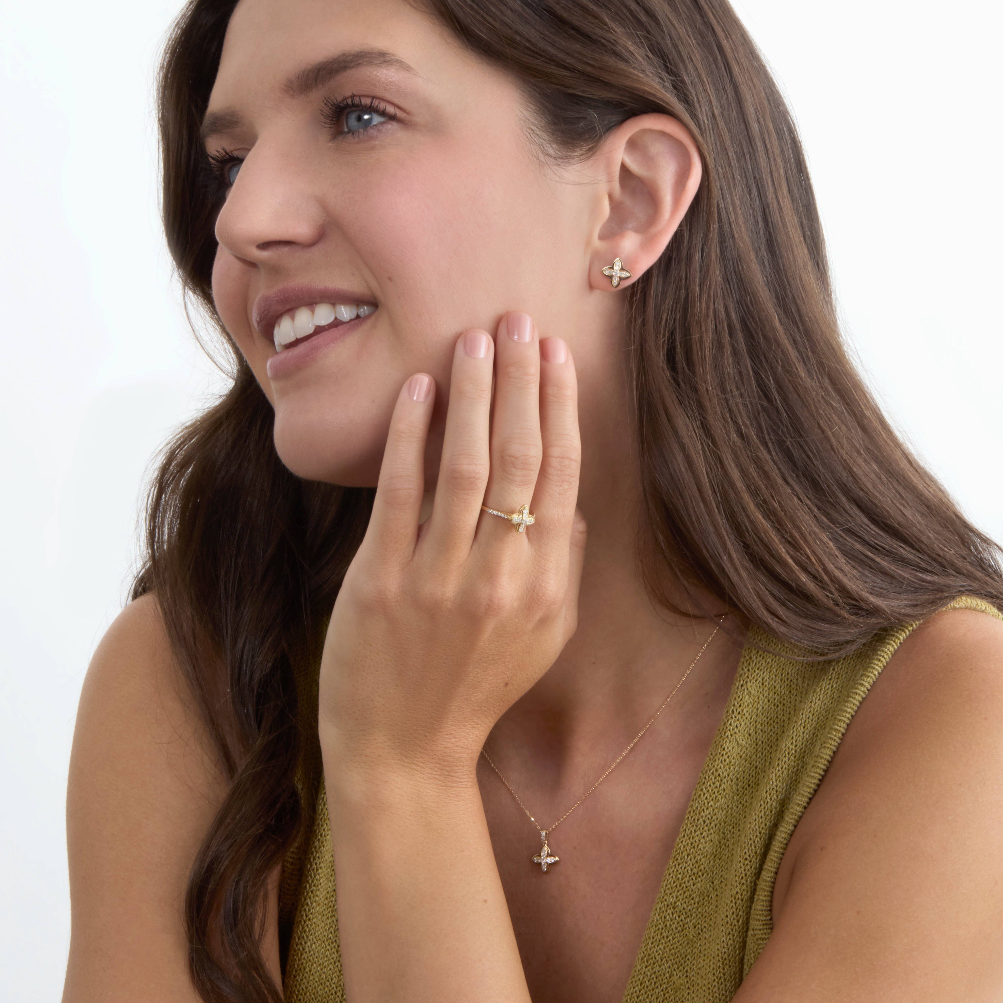 Accept the Silver Clover Engagement Ring's captivating symbolism. Carefully crafted from premium sterling silver, this exquisite piece features a four-leaf clover motif. Clusters of sparkling moissanite diamonds adorn each clover leaf, forming a stunning display of brilliance and a timeless representation of good fortune and wealth.