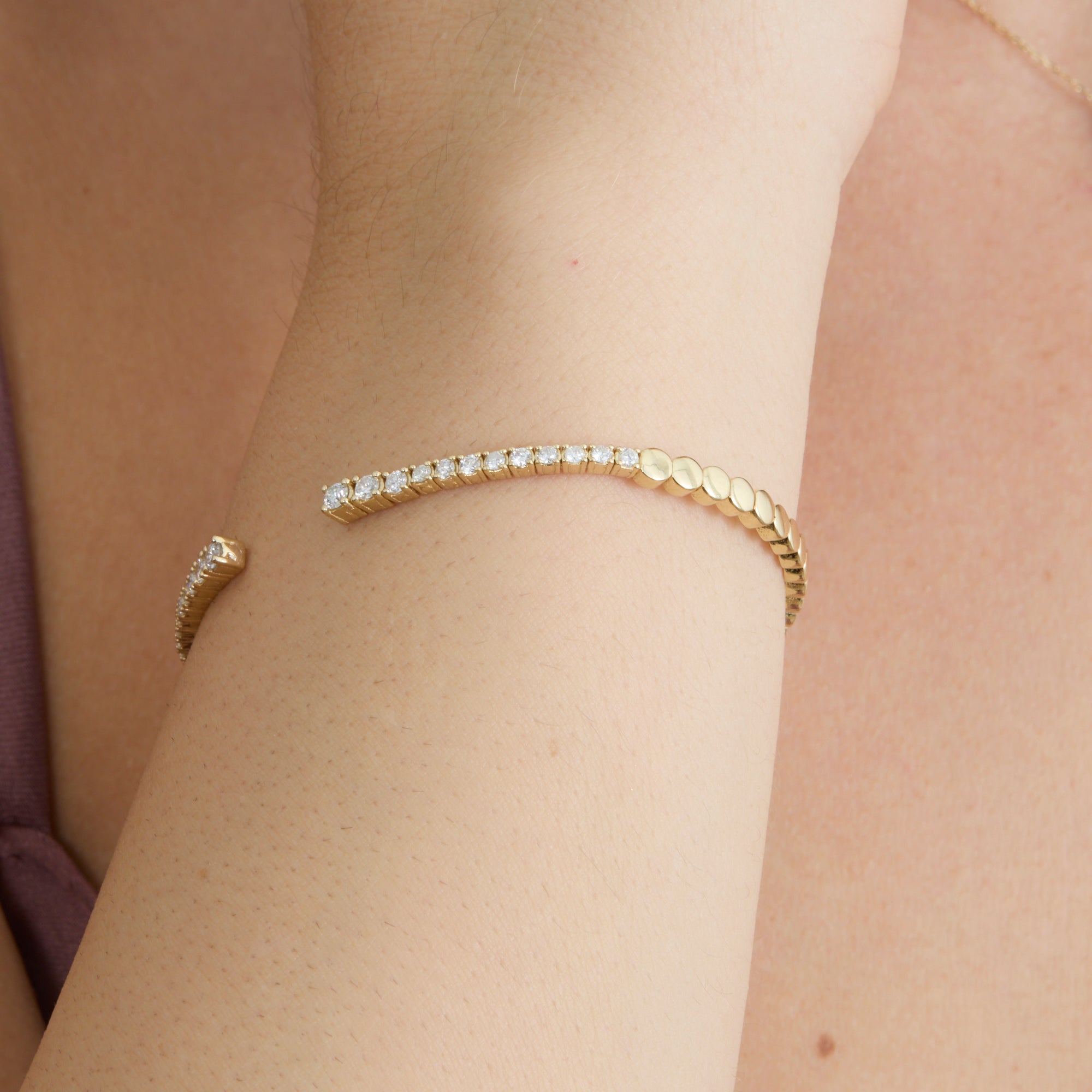 This gorgeous Moissanite Cuff Bracelet, which combines classic elegance with contemporary design, is sure to turn heads. A subtle touch of sophistication is added by the flat band's delicate beaded texture. Each end of the cuff is embellished with twelve graduated moissanite stones that have been painstakingly set in a pavé fashion, producing a stunning show of sparkle. It fits comfortably thanks to its flexible open design, which makes it ideal for both special occasions and daily wear.