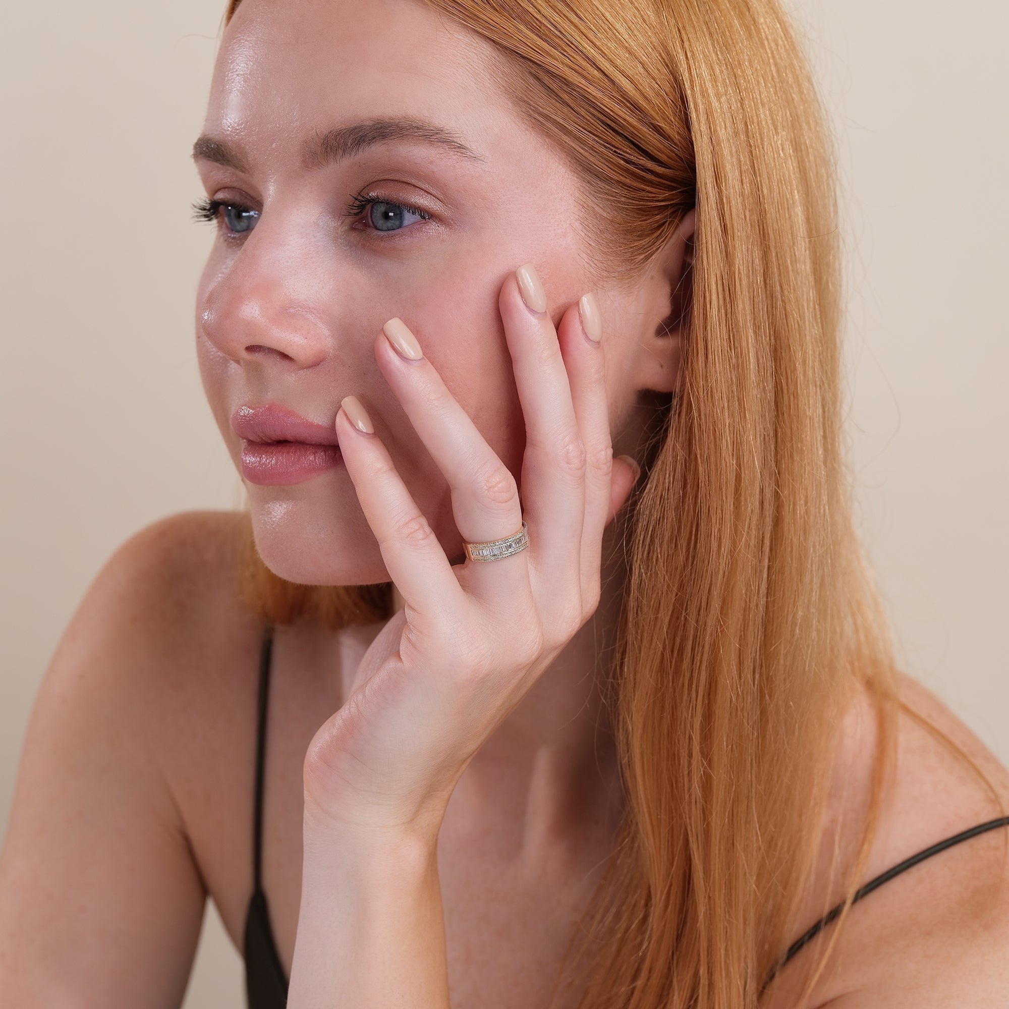 Our baguette moissanite diamonds create a stunning architecture all their own, inspired by ancient architecture with marble pillars! Our silversmiths' intricate details and timeless design are expertly crafted by hand. Wear it as your distinctive engagement ring, your statement wedding band, or your daily ring stack—it's already stacked for you!