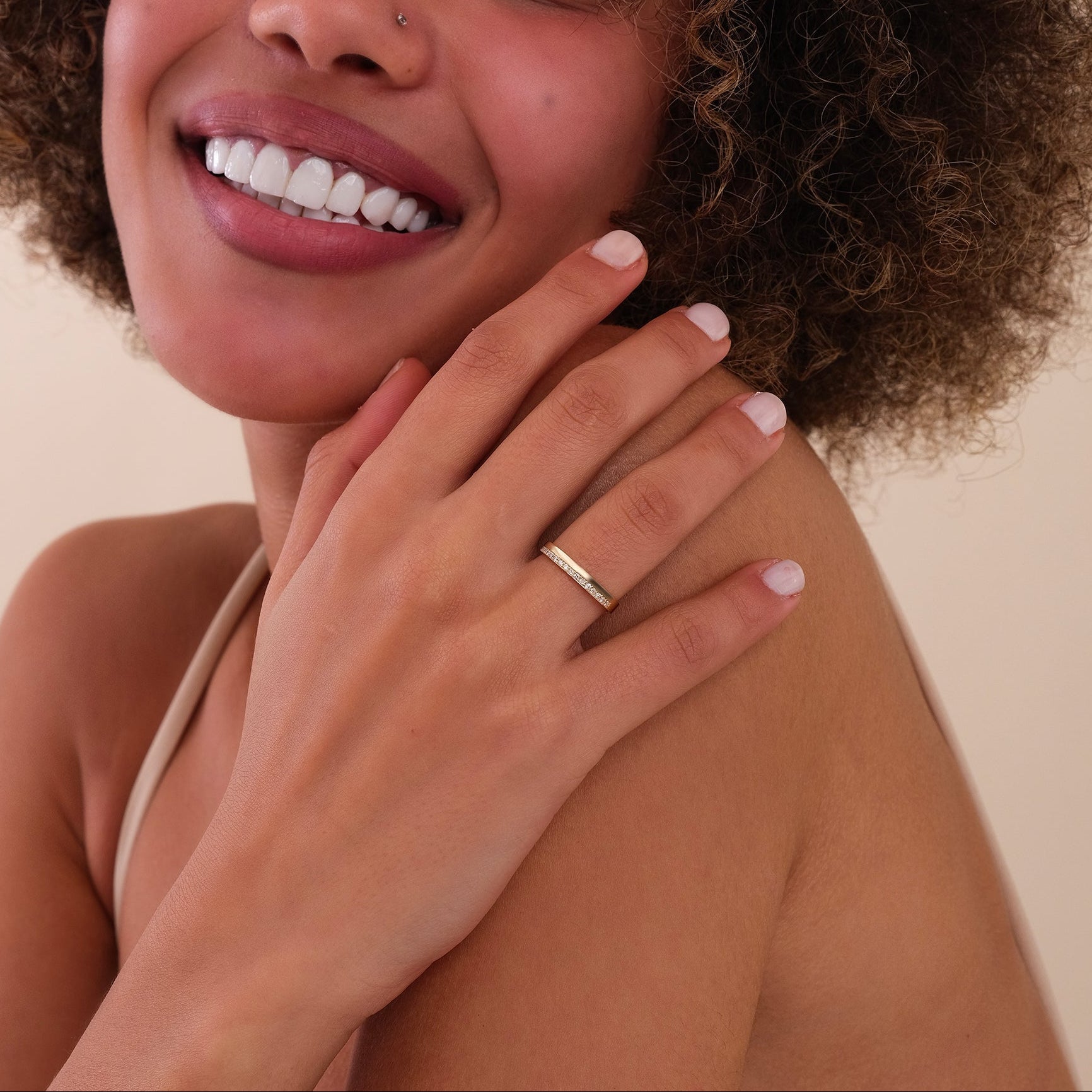 With our Moissanite Half Eternity Band, you can commemorate your unending love. With half of the band covered in glittering moissanite stones and the other half left bare, this solid sterling silver wedding band has a distinctive design that represents the path of love. This exquisitely crafted ring, which is handcrafted and exhibits timeless elegance and enduring beauty, is the ideal anniversary gift idea.
