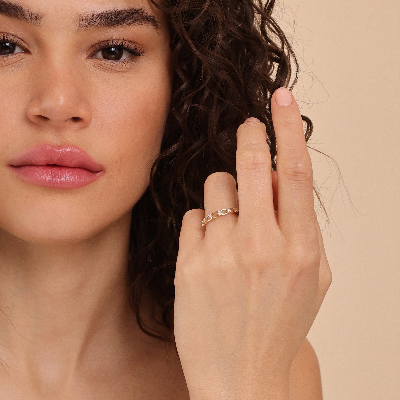 This distinctive diamond chain link ring is a contemporary interpretation of a traditional design. Its simple design showcases a half-eternity band of glittering Moissanite diamonds set in solid 925 sterling silver. An ideal piece to make a statement at any event.