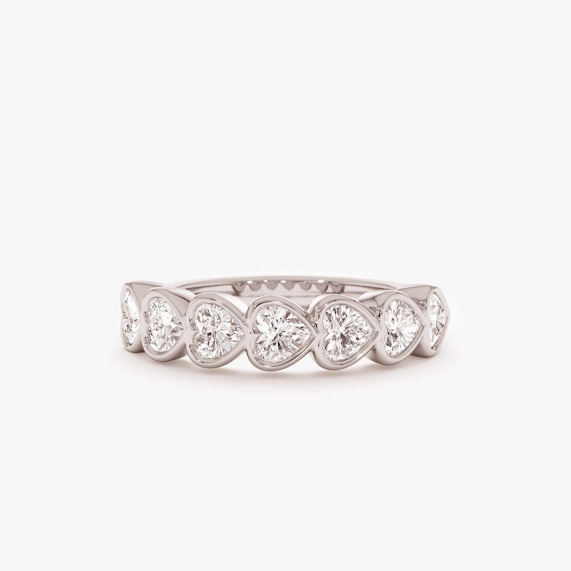With our distinctive heart-shaped moissanite half-eternity ring, discover contemporary romance. With its captivating collection of heart-cut moissanite stones, each individually bezel-set in gleaming sterling silver, this eye-catching band redefines classic elegance. The stones' unique shape produces a striking and modern look.