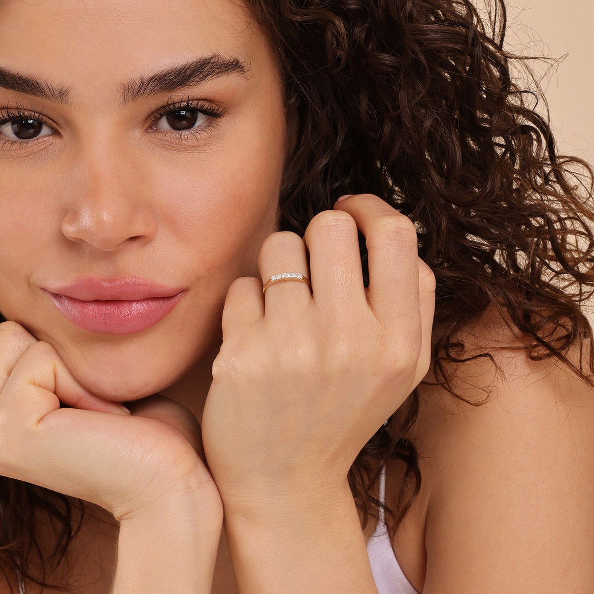 The Minimalist Square-Cut Moissanite Ring exudes subtle elegance. A smooth band of solid sterling silver highlights the brilliance of six precisely aligned square-cut moissanite stones in this delicate yet alluring piece.