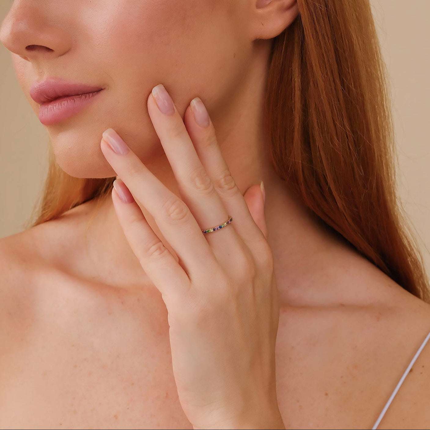 Take in a rainbow of sapphires that will enliven your stack of rings every day! This exquisite piece of jewelry featuring the September birthstone is painstakingly crafted by hand from premium sterling silver. A timeless celebration of style and uniqueness, the delicate and exquisite tennis-style band features a range of sapphire hues.