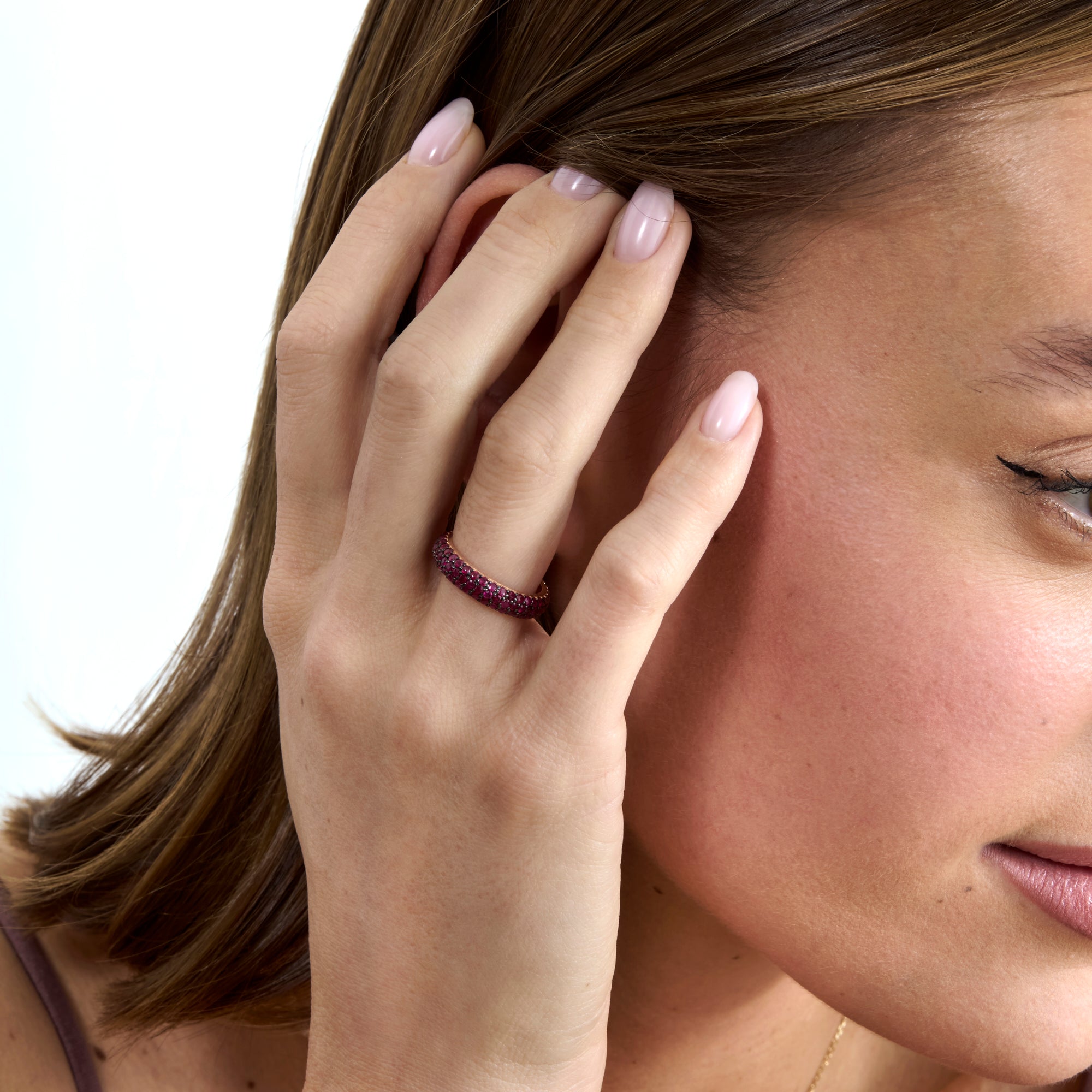 The Ruby Glow Statement Ring is a captivating work of art that exudes fiery elegance; ignite your passion with it. This gorgeous ring has a captivating dome that is expertly crafted from sterling silver and covered in a pavé setting of vivid rubies. A sense of passion, strength, and timeless beauty are evoked by the rubies' brilliant display of color and light.