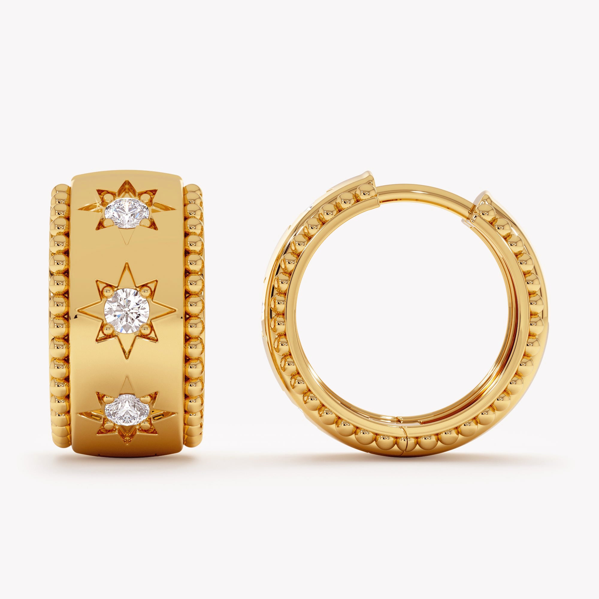 The Meteor Shower Huggie Earrings will add a touch of cosmic elegance to your collection. Each sterling silver hoop features a delicate starburst design embellished with glittering moissanite stones. These huggies are a classic yet contemporary statement piece thanks to the elaborate beaded edge, which adds a touch of vintage charm. They give any ensemble a subtle celestial sparkle and are ideal for special occasions as well as everyday wear.
