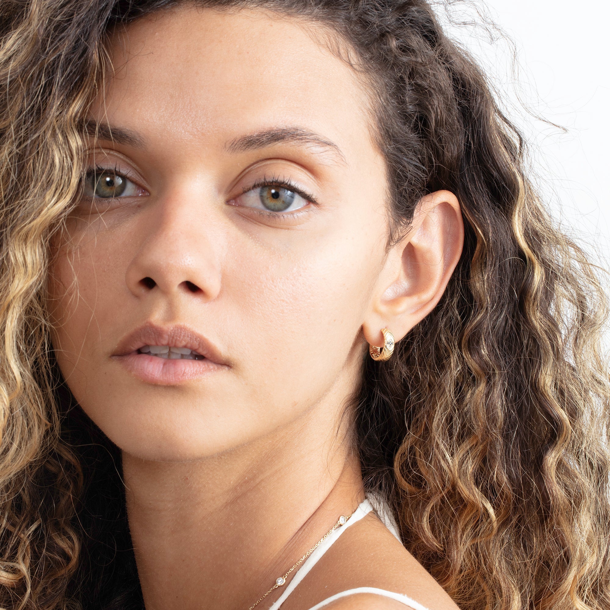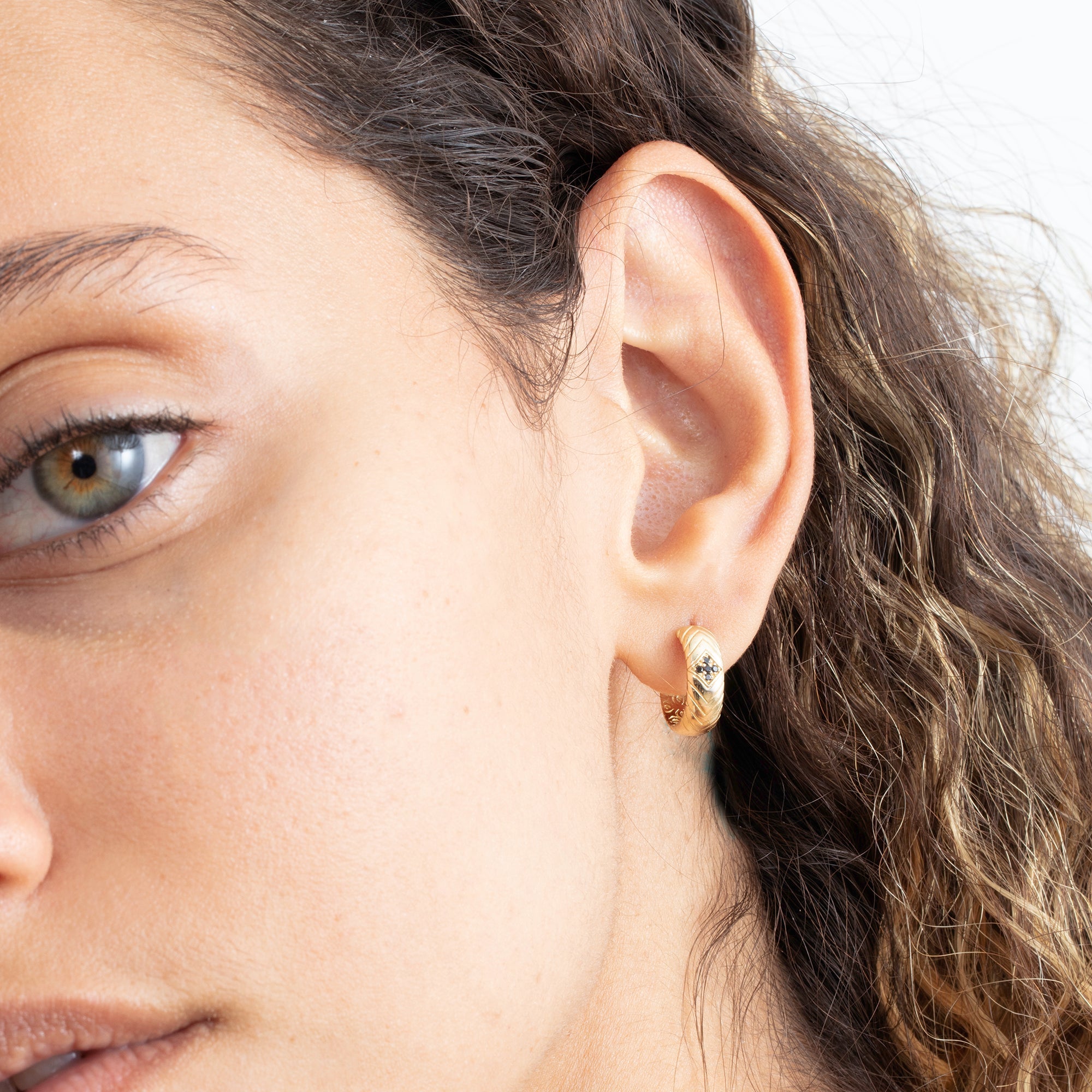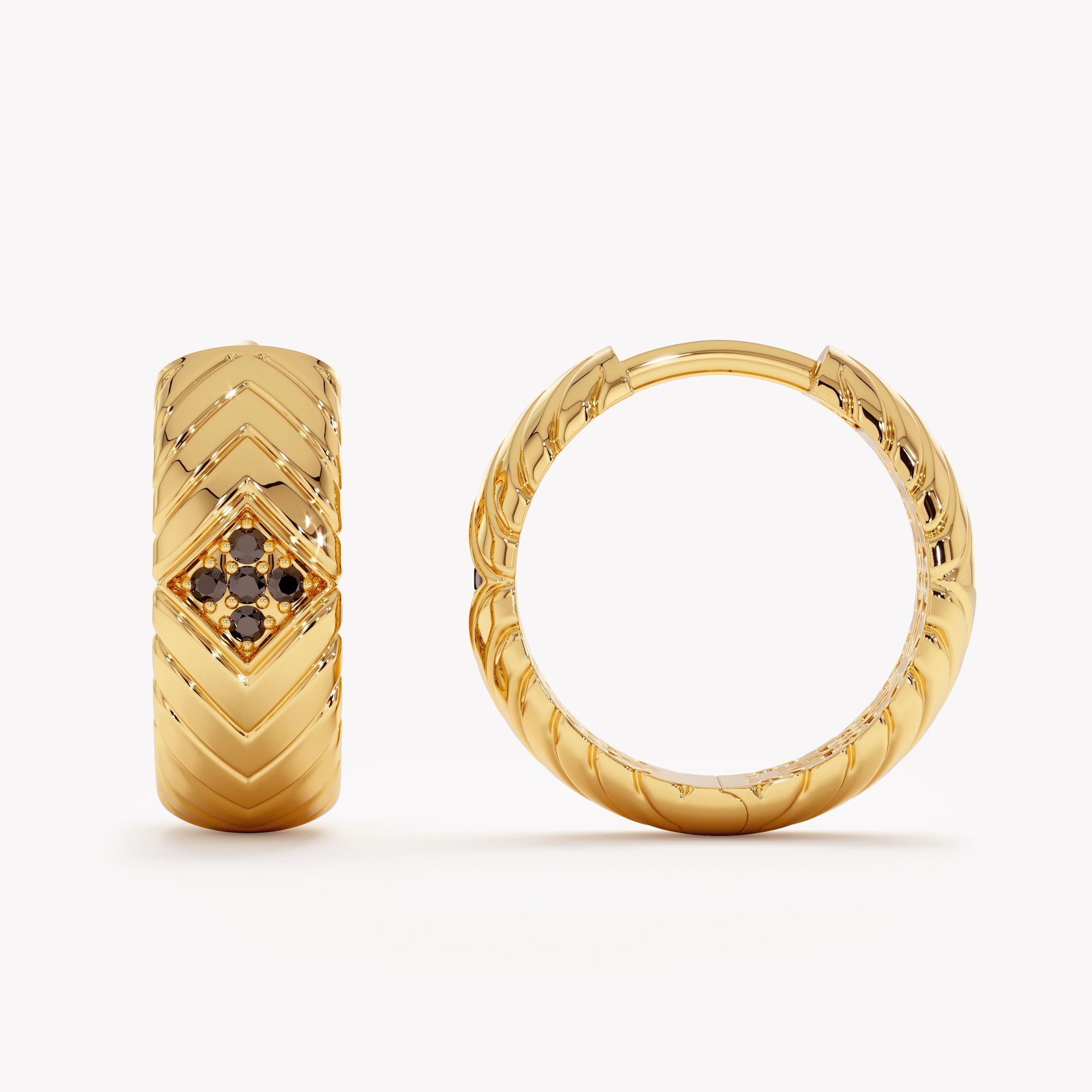 The Polished Edge Huggies Earrings will turn heads. These chunky huggies are made of sterling silver and have a striking cross-inspired design. They have a modern edge thanks to the sparkling black moissanite stones. A delicate chevron pattern adds depth and a modern touch to the textured silver surface. Ideal for layering with other earrings to create a personalized look or for bringing a dash of bold elegance to your daily ensemble.