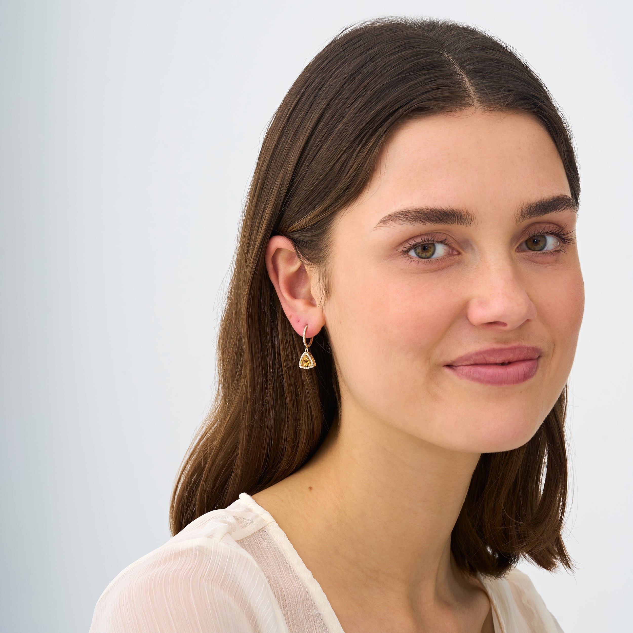 The Amber Ray Huggies will add some brightness to your appearance. The brilliant trilliant-cut citrine gemstone in each earring is exquisitely encircled by shimmering moissanite stones, creating a stunning halo effect. These huggies, which are made of sterling silver, are intended to provide the ideal balance of glamour for special occasions and everyday elegance.