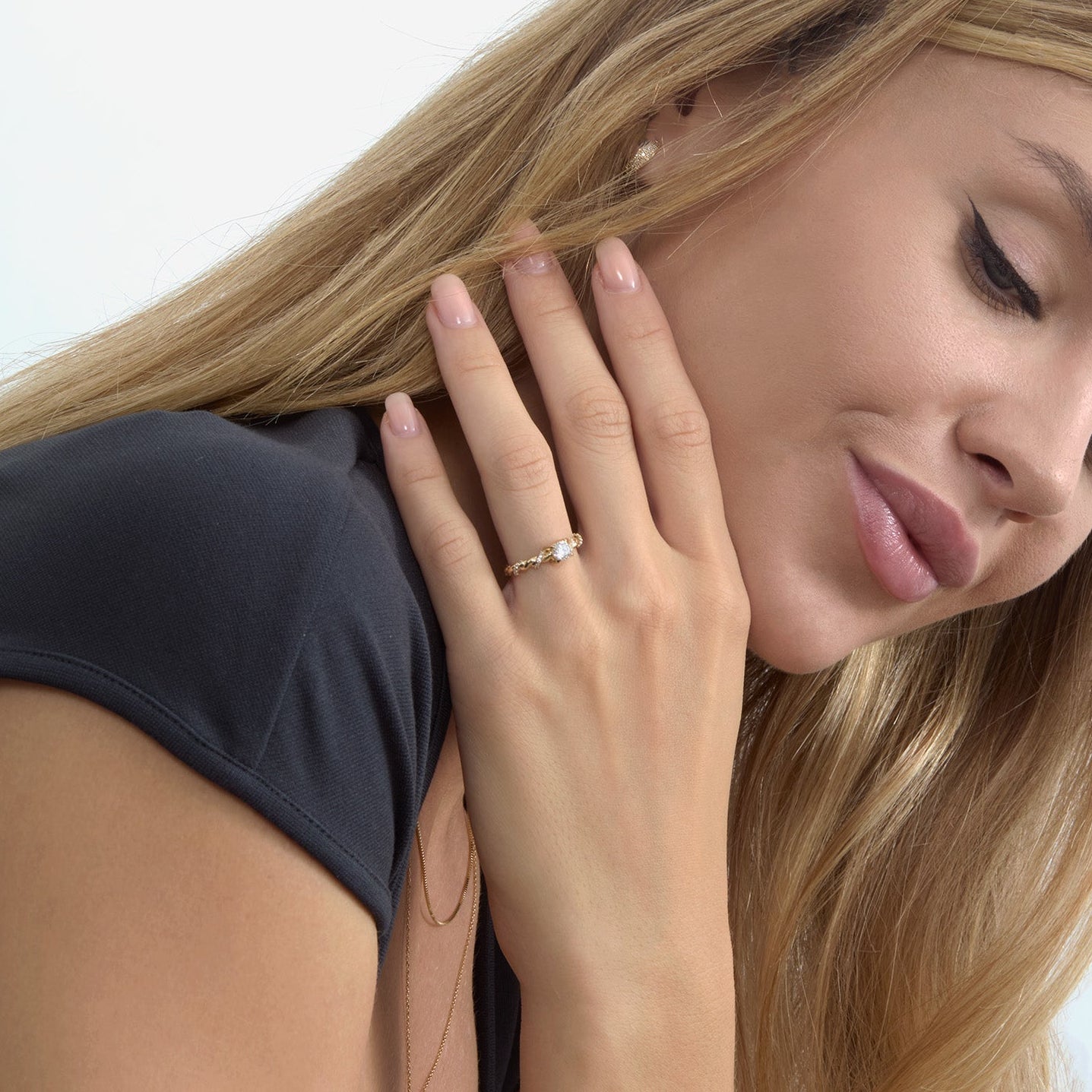 With this alluring Twirl Diamond Engagement Ring, you can commemorate your love story. The captivating twisted band design of this one-of-a-kind ring represents the entwining of two lives. Smaller Moissanite diamond accents adorn the band, adding a touch of brilliance and boosting the overall sparkle, while a sparkling Moissanite diamond takes center stage. This ring is a stunning representation of your unwavering devotion and love.