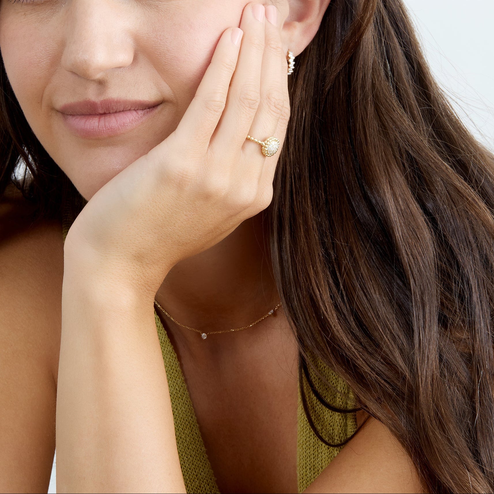 With our Pave Diamond Beaded Light Ring, you can honor classic style. This gorgeous statement ring is made of solid sterling silver and comes in rhodium or polished finishes. It has a pave-set moissanite diamond disc encircled by a distinctive bead design for extra texture and charm. Carefully crafted from moissanite diamonds that are ethically sourced, this ring makes a luxurious addition to your collection or the ideal anniversary present. This piece, which is made of sterling silver, is sophisticated and stylish.